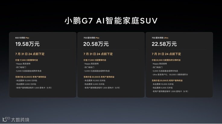 7月3日,小鹏汽车旗下全新中型SUV——小鹏G7正式上市,号称是全球首款L3级算力的超级AI汽车。新车共推出602长续航Max、702超长续航Max、702超长续航Ultra三个版本,官方指导售价分别为19.58万元、20.58万元和22.58万元,上市即刻可以交付。