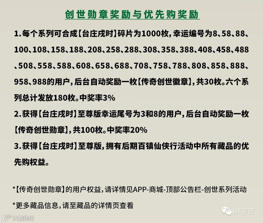 为了奖励第一批喜爱并愿意长期支持DT宇宙、支持百镇仙侠行计划的用户,在公司周年庆之际,首次推出「传奇创世勋章」,全球限量发行998份,永不增发!