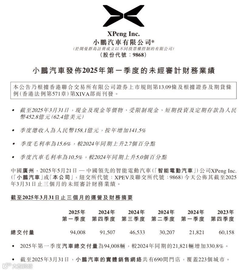 2025年第一季度,小鹏汽车实现总收入为158.1亿元,较2024年同期上升141.5%,较2024年第四季度下降1.8%。其中,汽车业务实现143.7亿元营收,比2024年第一季度的55.4亿元增长 159%,环比下滑2.1%;净亏损6.6 亿元,同比收窄51.5%,环比收窄50.1%;毛利率达15.6%,同比提升2.7个百分点,创下单季度历史新高。其中,汽车毛利率达10.5%,同比提升5个百分点,实现连续七个季度增长;截至2025年3月31日,小鹏汽车现金及现金等价物、受限制现金、短期投资及定期存款为452.8亿元。