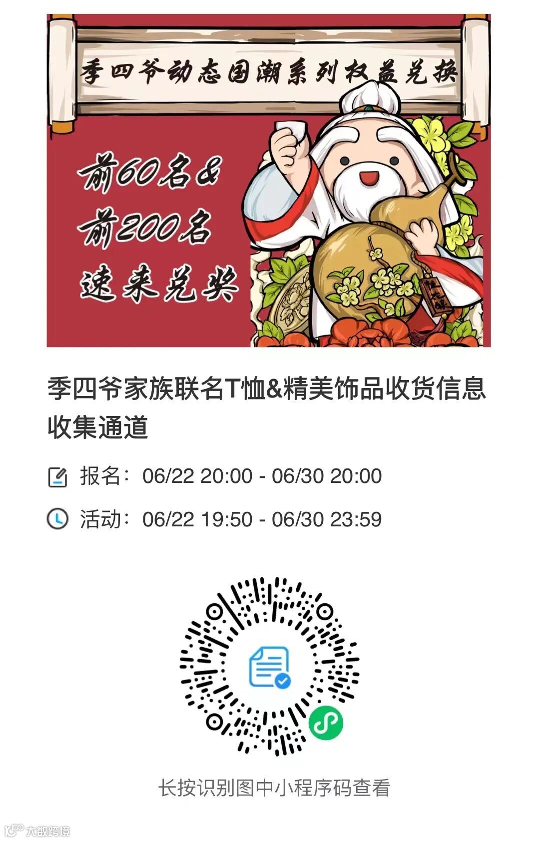 本次交易金额排名前60名(同等金额以下单时间先后为标准)的玩家可获得季四爷家族的联名T恤,T恤均码随机发放;交易金额排名前200名(同等金额以下单时间先后为标准)的玩家可获得季四爷家族的精美饰品1件,请您在活动截止前提供正确无误的收货信息,奖品预计于2022年7月20日前发出。