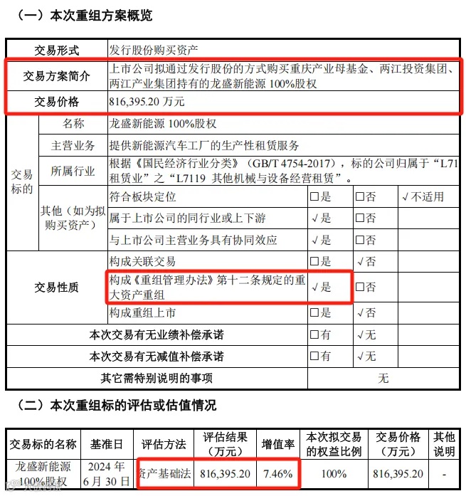 同时,赛力斯发布《发行股份购买资产报告书》。公司本次交易已经完成所需履行的决策和审批程序,不存在尚需履行的决策和审批程序。这意味着,赛力斯拟通过发行股份的方式购买重庆两江新区龙盛新能源科技有限责任公司100%股权事项,可以进入实际操作阶段。