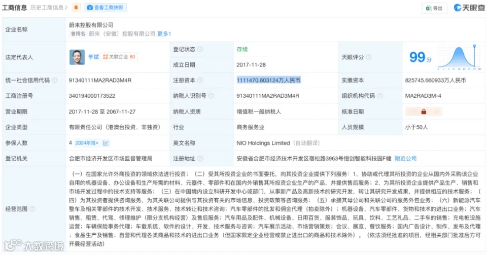 与此同时,天眼查App显示,蔚来控股有限公司发生工商变更,注册资本由约82.57亿人民币增至约111.15亿人民币。该公司成立于2017年11月,法定代表人为李斌,经营范围包括新能源汽车整车及相关零部件的技术开发、技术服务、技术转让和技术咨询等,由Nio Nextev Limited、NIO User Enterprise Limited、合肥建翔投资有限公司等共同持股。