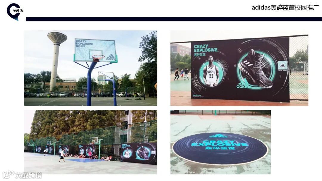 2016年阿迪达斯推出全新高帮 Boost篮球鞋Crazy Explosive Primeknit ,基于产品特点,选择了男生为主的高校为投放场景,精准触达目标消费群,一般是以地铁和篮板贴的精准媒体形式。