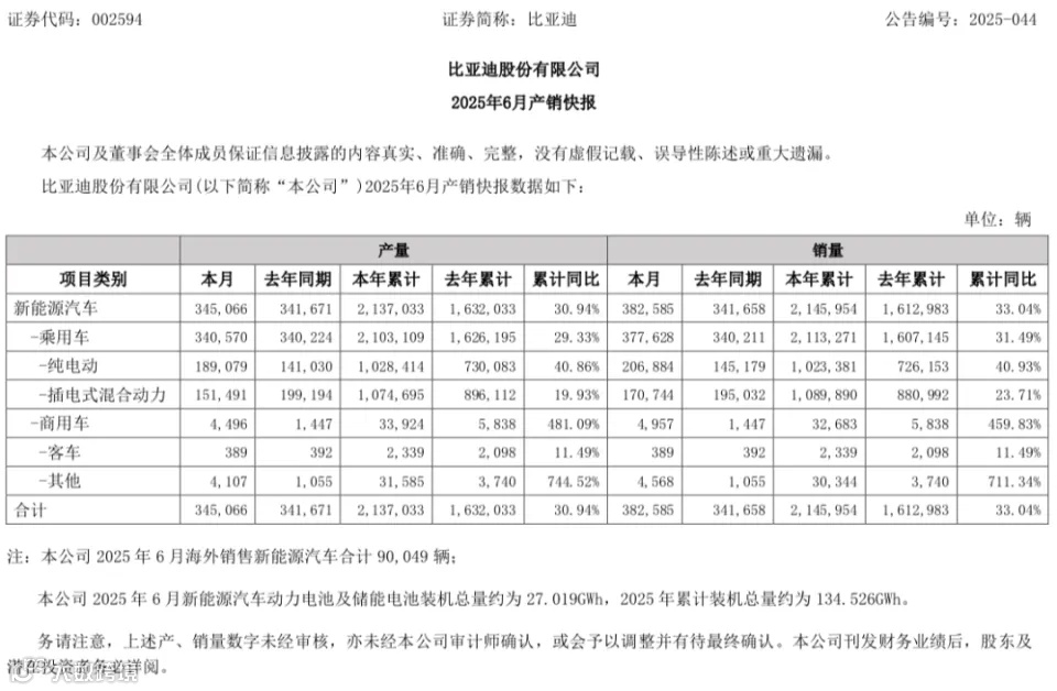 2025年6月,比亚迪新能源汽车销量为38.26万辆,同比增长11.98%。其中,其中,海外市场销售约8.97万辆,同比增长229.8%;2025年前6个月,比亚迪新能源汽车累计销量为214.60万辆,同比增长33.04%。今年销量目标为550万辆,完成年度销量目标近40%。其中,海外累计销量超47万辆,同比增长132%。
