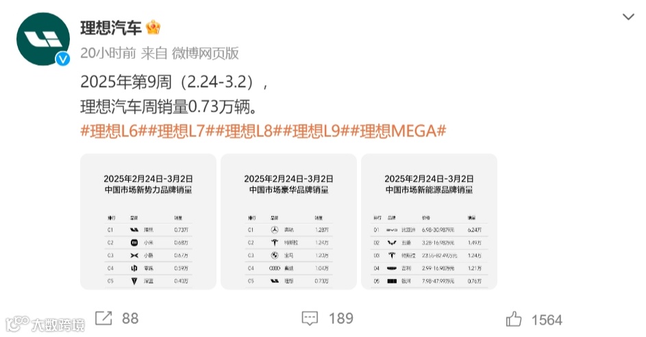中工汽车网消息,3月4日,理想汽车发布2025年第9周(2月24日—3月2日)销量数据。具体来看,理想汽车周销量达0.73万辆,在中国市场新势力品牌销量中获得第一;在中国市场新能源品牌榜中排在第六;在中国市场豪华品牌销量榜单中位列第五。