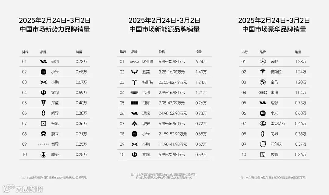 在豪华榜TOP10中,奔驰、宝马和奥迪均以月销过万的成绩保持前四,周销量分别为1.28万辆、1.20万辆、1.04万辆。特斯拉通过1.24万辆的成绩,位于榜单第二名。理想汽车和小米汽车紧随其后,分别处在第五和第六。