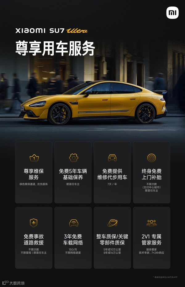 根据官方公布的消息,小米SU7 Ultra车主专享八项用车权益,包括:尊享维保服务、免费5年车辆基础保养、免费提供维修代步用车、终身免费上门补胎、免费事故道路救援、3年免费车载网络、整车质保/关键零部件质保、2V1专属管家服务。