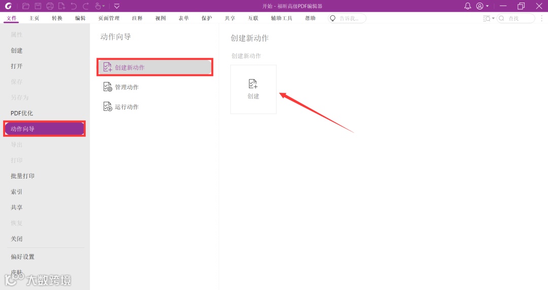 1.首先打开福昕高级PDF编辑器,点击工具栏“文件”中的“动作向导”,借助“动作向导”功能,你可以批量对文件执行多个动作。然后选择“创建新动作”,点击“创建”;