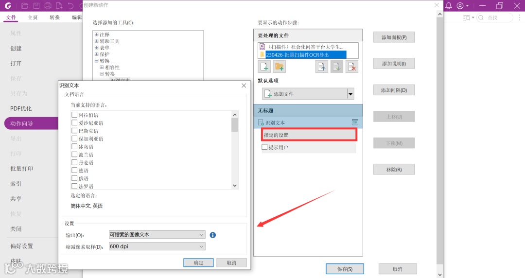 4.你需要勾选文档中包含的所有语言,如简体中文、英语、日语等,以提高识别文本的正确率,在输出选项中选择“可搜索的图像文本(原始图像)”,然后点击“确定”,这样你便可以轻松搜索电子试卷中的信息并且保留试卷中学生原本的字迹。
