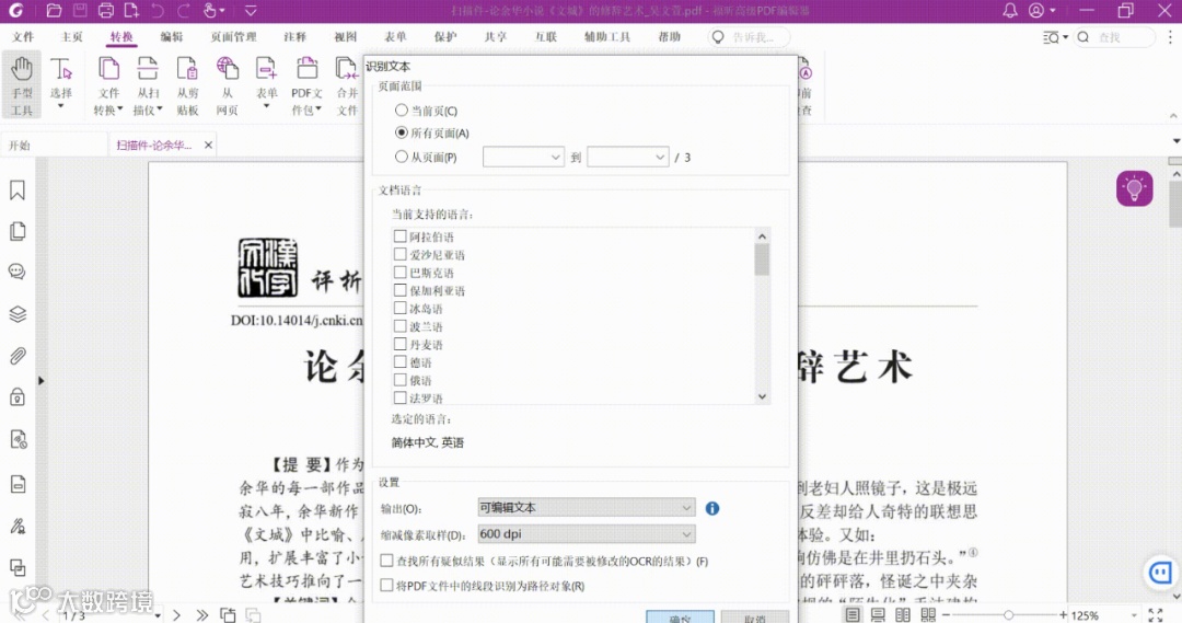 在对话框中,你可以设置识别的“页面范围”、“文档语言”,并需要在输出选项中选择“可编辑文本”;