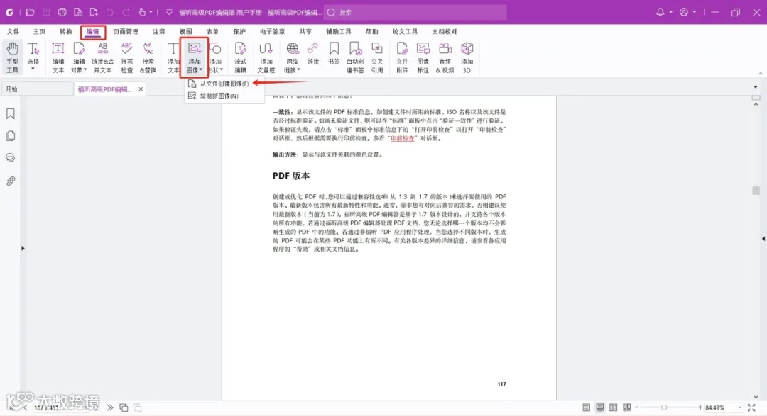 首先利用福昕高级PDF编辑器打开一份文档,点击“编辑”>“添加图像”>“从文件创建图像”,从电脑中选择一个图片打开插入即可。