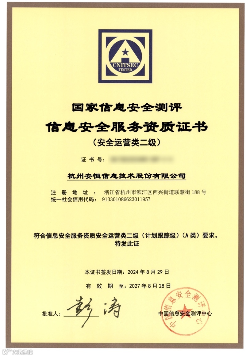 近日,中国信息安全测评中心公布了首批安全运营类(二级)服务资质获证企业名单,安恒信息成为首批获证企业。