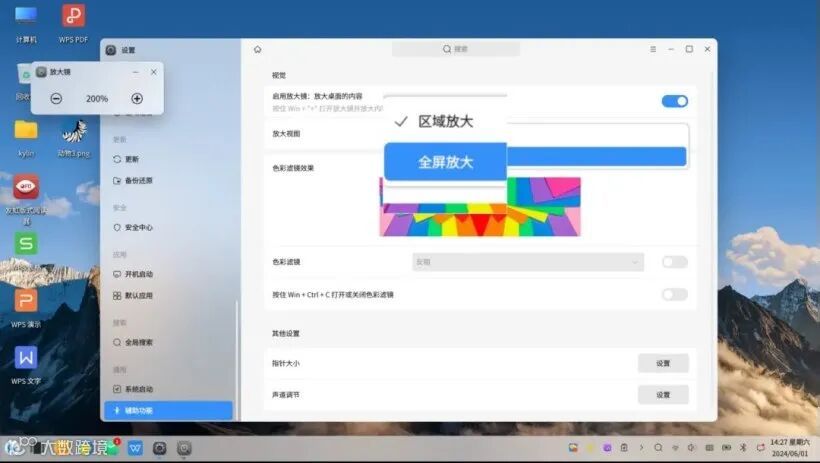 放大镜:帮助低视力用户看清桌面上的内容,用户能够选择仅放大当前操作区域的内容或全面放大整个桌面视图,系统还提供了快捷键配置。