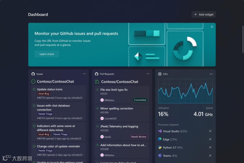 开发人员主页(Dev Home)是一个控制中心,能够在一个位置跟踪所有工作流和编码任务。它具有简化的设置工具,使您能够在集中位置安装应用程序和包,扩展允许您连接到开发人员账户(例如 GitHub),以及带有各种以开发人员为中心的小部件的可自定义仪表板,为您提供触手可及的信息。