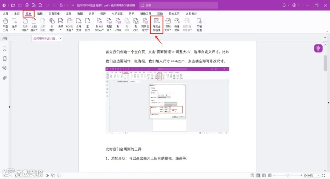 首先利用福昕高级PDF编辑器,打开一份需要提取图片的文档,点击导航栏“转换”>“导出全部图像”,选择一个存储位置即可。