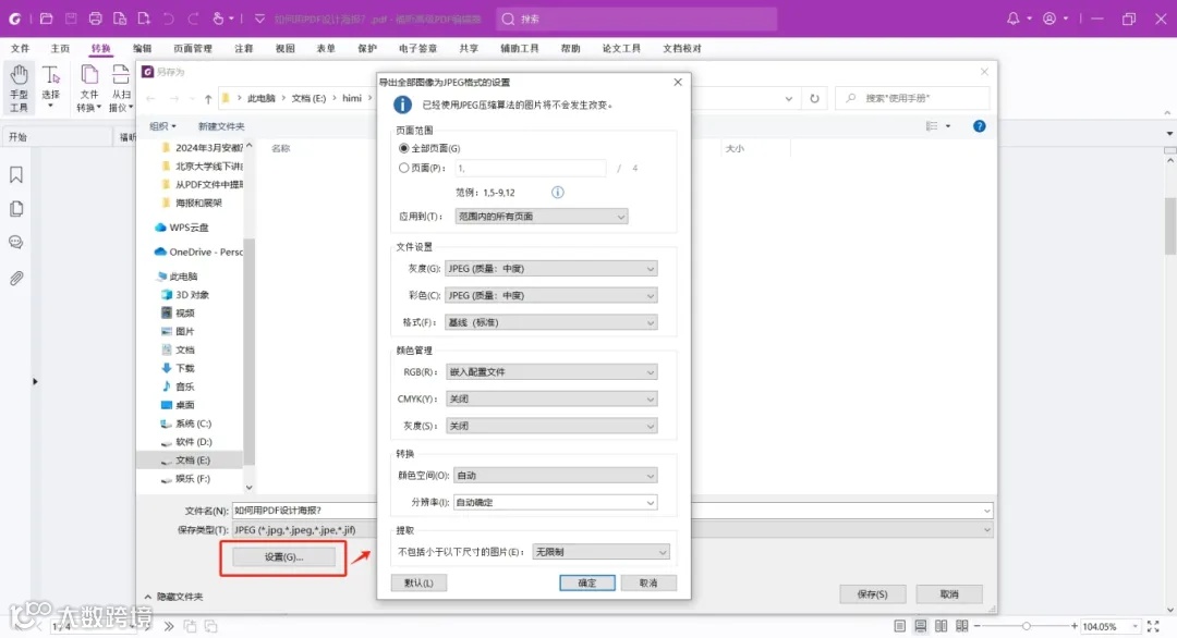 如果只想导出一部分图片,或者是想调整图片清晰度、色彩空间、分辨率等,还可以在点击“保存”之前,点击“设置”按钮进行更多导出设置。