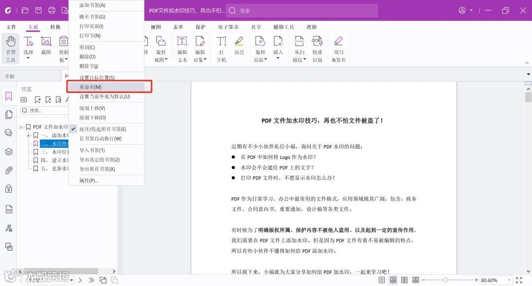 3、重命名:双击书签或右键对应的书签进行重命名