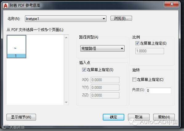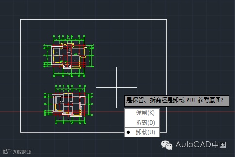 PS:当然也可以一开始直接使用PDFimport命令而不需要先使用attach命令将PDF文件导入进来,但是如果直接使用PDFIMPORT命令的时候只能将整个PDF文件全部输入成DWG格式的对象,也不能指定是否保留,拆离还是卸载PDF参考底图。