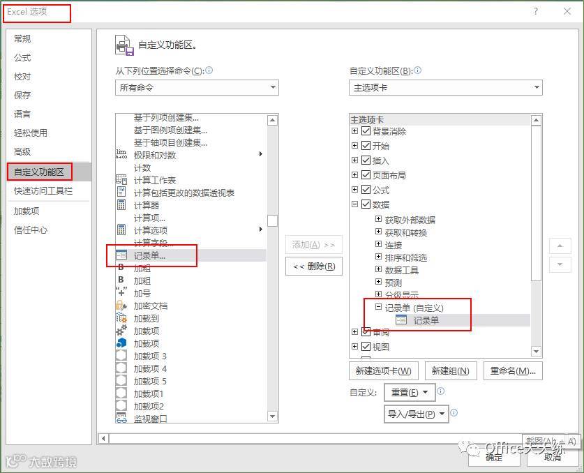 1、点击文件菜单,选项,在自定义功能区右边新建一个功能组:记录单,然后在左侧选择:所有命令,找到记录单,添加到右边新增加的组中,确定。