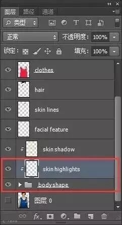 第十步:新建图层,命名为skin highlights,放在bodyshape的上面,并只作用于它。将混合模式设置为叠加,并调整透明度。效果如下: