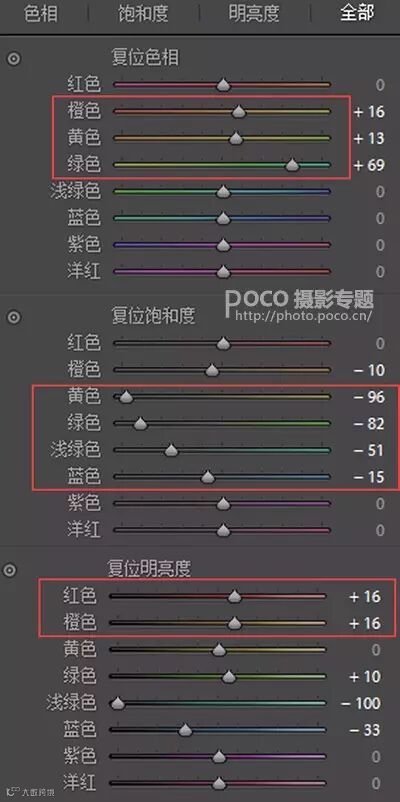 这一步比较关键,主要调整控制肤色的橙色,以及控制背景草地树叶的绿色、黄色还有衣服的蓝色。调节黄色橙色的色相,使肤色稍微往黄色靠一点,提高明亮度使模特变成小白脸。调整绿色和黄色的色相和明亮度,让背景呈现统一的青蓝色与人物区分开来。