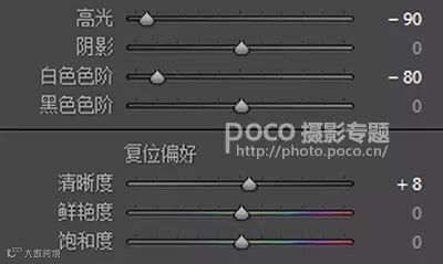 在LR中打开图片,降低色温,使画面偏冷。 色调向右偏一点使原本偏黄的肤色偏红 。然后加一点曝光修正偏暗的画面。