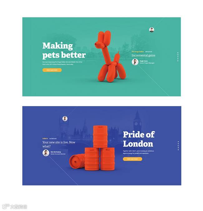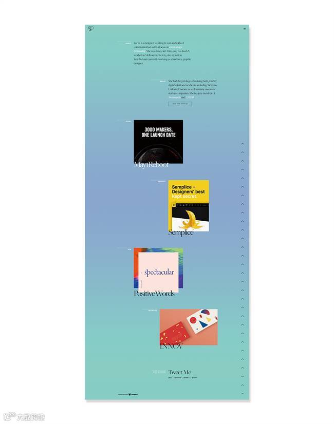 利用渐变色的变化,通过切换图片,渐变色也随即改变。由于渐变的饱和度较高,因此其上方的元素运用白色展示,使文字清晰可辨: