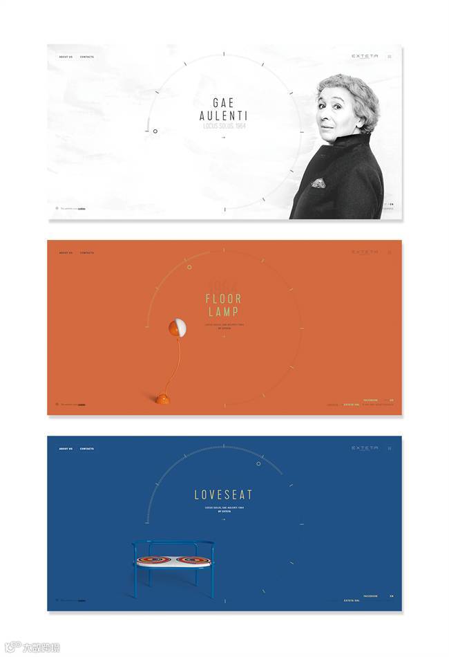 EXTET.R的首页设计非常巧妙地安排了一个类似时钟一样的圆形滚动播放主屏画面,画面采用不同的背景色和不同的展示主题。造型别致新颖: