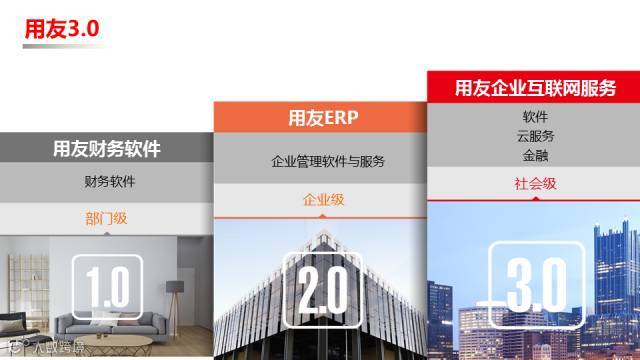 现在,用友基于移动互联网、云计算、大数据和人工智能的新一代企业计算技术,形成了以“软件、云服务、金融”为三大核心业务的企业互联网服务,业务领域从之前的企业管理扩展到业务运营和企业金融,服务层级从企业级走向社会级,这开启了用友发展的3.0时代。