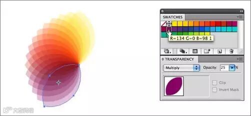 首先选中第2个图案,然后按Ctrl+D,你可以看到每按一次这个组合键,图案就会复制一次并进行10°的旋转。记得每复制一个图案,就给他填充一个颜色。