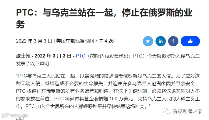 作为工业软件领域绝对的巨头,PTC也宣布停止在俄罗斯的所有运营业务和销售~