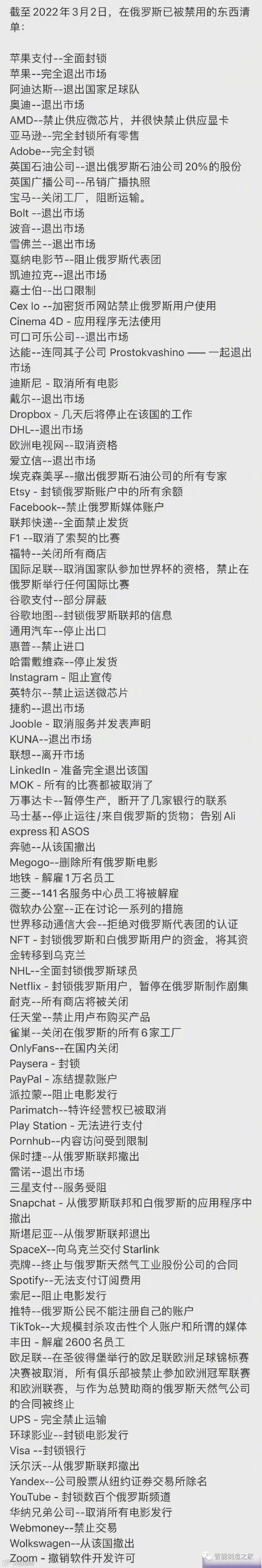 近期,全球众多领域的巨头,停止了对俄罗斯的销售。其中,苹果、微软、英特尔、AMD 、NVIDIA、IBM、谷歌、FACEBOOK、亚马逊、戴尔等全球知名科技公司均在列~