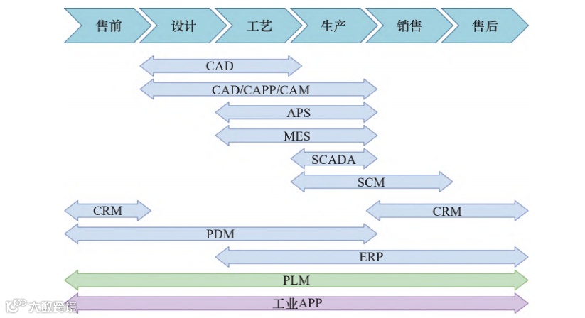 工业软件主要分为设计研发类工业软件,如计算机辅助设计(CAD)、计算机辅助工程(CAE)、计算机辅助制造(CAM)、计算机辅助工艺(CAPP)等;信息管理类工业软件,如产品生命周期管理(PLM)、企业资源计划(ERP)、生产执行系统(MES)等;工业控制类工业软件,如数据采集与监视控制系统(SCADA)、可编程逻辑控制单元(PLC)等。在工业产品的全生命周期内,需要多类工业软件的协同合作,因而跨软件的数据互操作极为重要。