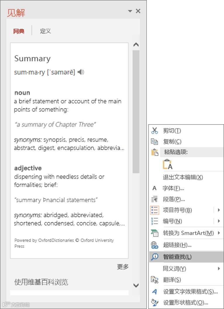借助必应的能力为 Office 带来在线资源,让用户可直接在 Word 文档当中使用在线图片或文字定义。智能查找功能使用用户标出的词语和文档中的其他上下文信息,呈现网页中的搜索结果,最重要的是所有这一切都在文档中进行,小编都醉了,这种体验真诱人!