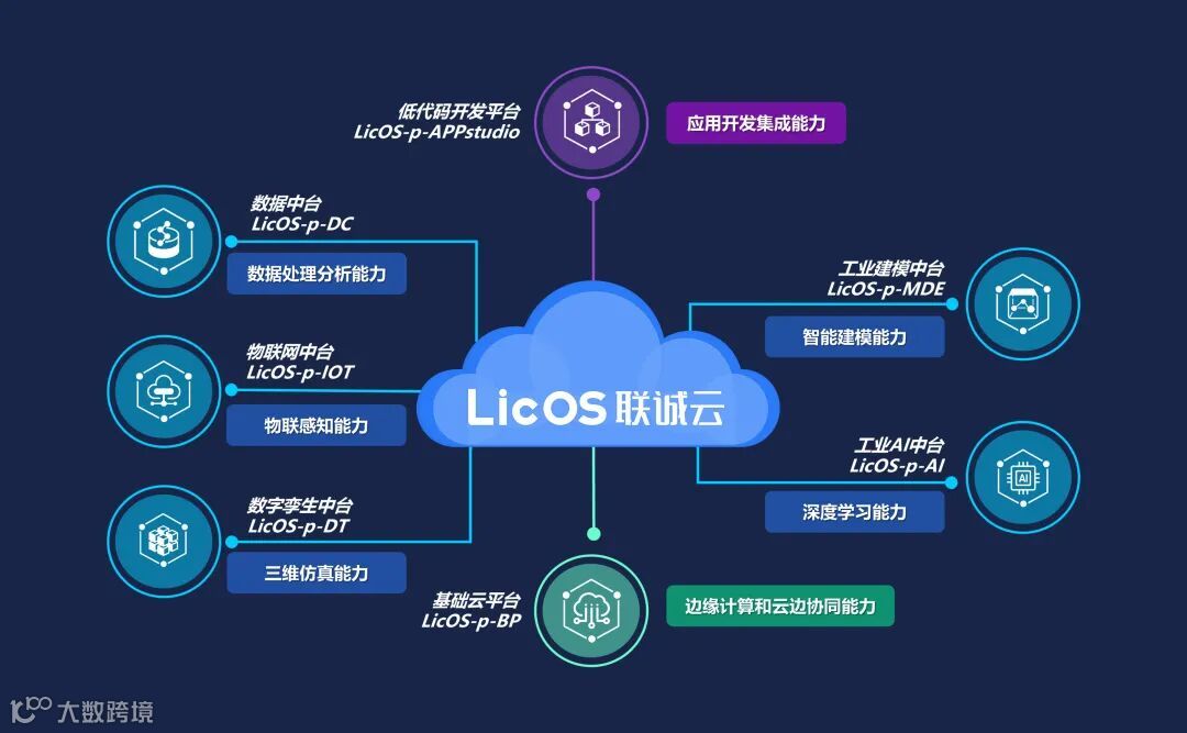 “联诚云LicOS”工业互联网操作系统,通过PAAS平台服务层的数据、物联网、工业建模、数字孪生、AI等5大中台支撑,向下对接海量工业装备、仪器、产品,向上支撑工业智能化APP应用的快速开发与部署,是工业互联网的重要基石与关键核心。