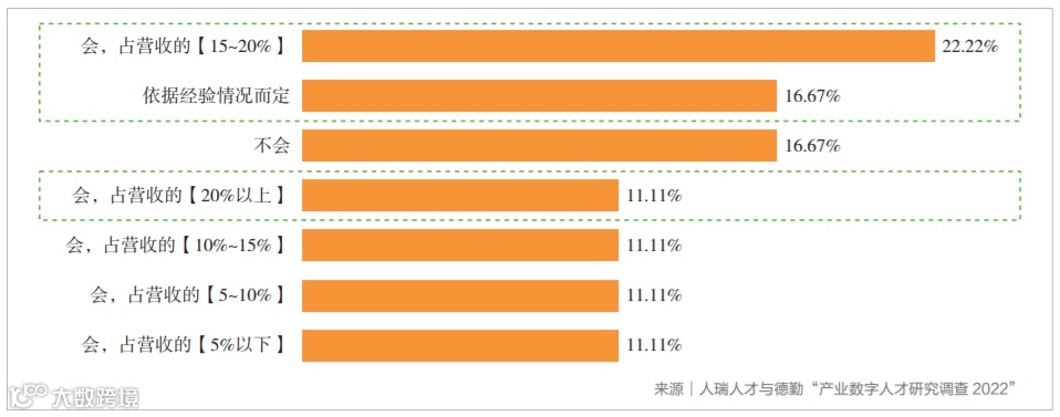 虽然头部金融机构数字化程度显著提升,但当前整个金融行业仍处在数字化转型的初级阶段,未来提升空间巨大。据人瑞人才与德勤中国近日发布的《产业数字人才研究与发展报告(2023)》,金融企业持续加大数字化投入是必然趋势,超80%的受访企业决策者表示会继续增加数字化投入,约占企业营收的15%~20%左右。