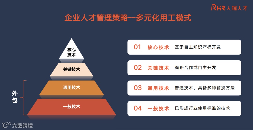 除了率先推出“井”型数字人才胜任力模型,人瑞人才还在多元化用工、数字人才生态链、社会化共享用工平台等多方面做了探索和创新,并在企业用工策略上给出建议和解决方案。比如多元化用工,张建国建议将技术分成核心技术、关键技术、一般技术、通用技术等四类,并针对不同的技术定位采用不同用工策略,通用技术和一般技术可以考虑采取外包的方式。