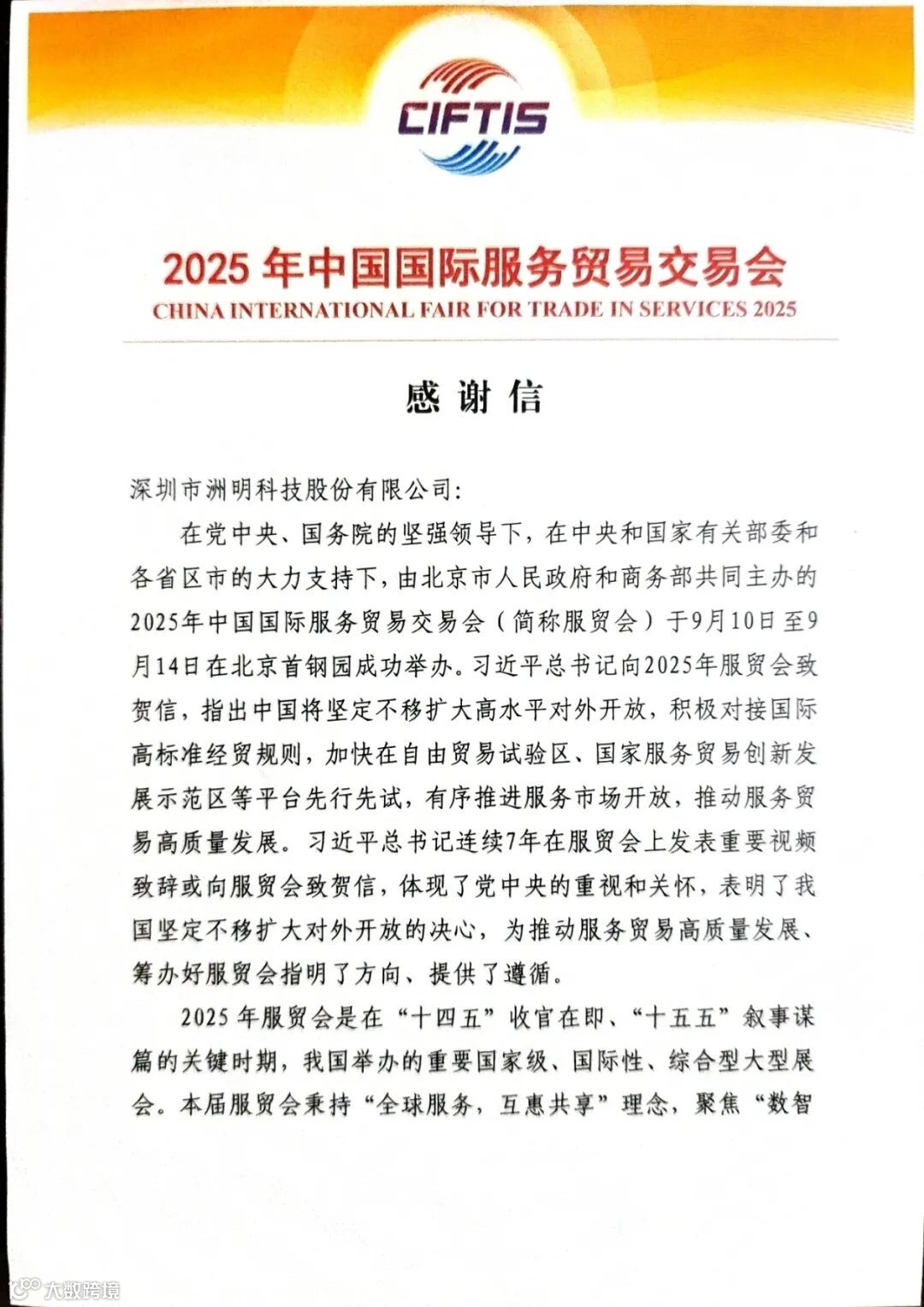 近日,洲明照明收到中国国际服务贸易交易会(服贸会)发来的感谢信,信中对公司作为参展商在盛会期间的精彩呈现与价值贡献给予高度认可,并致以诚挚谢意。作为光显与户外照明领域的领军企业,洲明照明携自主 LED 显示技术及场景化解决方案亮相服贸会,通过优质产品与创新方案充分展现行业前沿实力,为展会增添科技亮点,获得主办方与现场观众的广泛好评。此次致谢既是对企业参展成果的肯定,更是对技术实力的激励。未来,洲明照明将持续深耕核心技术,以更优质的产品与方案参与重要展会,传递中国智造价值,践行企业责任与担当。 长按进入,了解更多信息