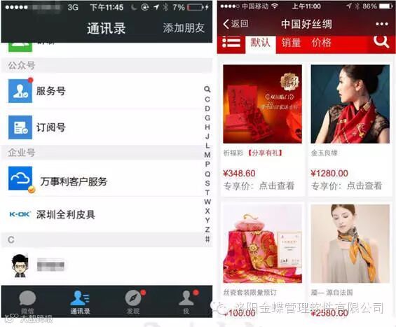 面对传统企业对导入在线流量,快速响应消费者需求,高效处理业务流程的迫切需求。金蝶顺势推出连接100,该产品能快速实现在线线下无缝对接,直接导流用户,将海量的订单、数据等快速导入业务系统,为消费者提供零距离的服务,解决目前传统企业虽“触网”却无法适应互联网交易节奏的难题。同时,连接100能够说明企业汇聚消费者行为数据,为企业创新营销策略提供强力支持。未来,连接100将拓展个人定制等增值服务以及整合第三方开发的企业云服务。如万事利集团,以丝绸文化创意为主业,年营业规模近百亿人民币,正在借助连接100,通过微信企业号,实现O2O营销转型,销售额高达千万。在转型探索的思路上,万事利与金蝶互联网转型方向不谋而合。通过连接100平台,万事利的企业客户只需要关注万事利的微信企业号就可以使用“微订货”轻应用。通过这个轻应用,万事利客户可以随时随地了解新品、促销信息,同时客户还可以随时使用“微客服”,与对应的客户经理进行微信沟通,逢年过节万事利也会给客户发消息进行关怀。通过这种方式,实现了企业与客户的零距离沟通。如下图为万事利在微信企业号的入口。