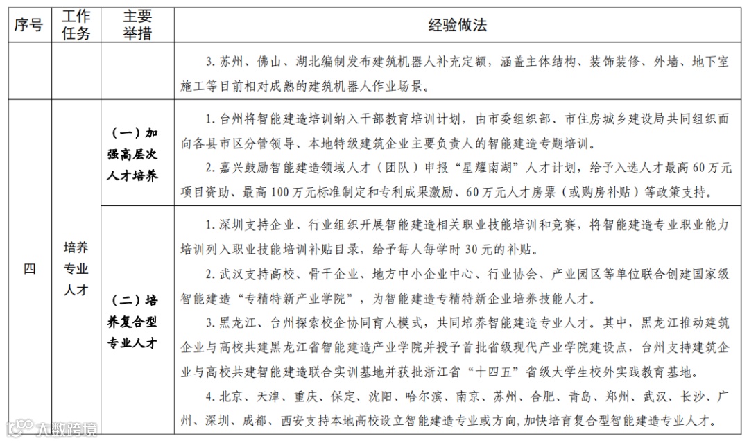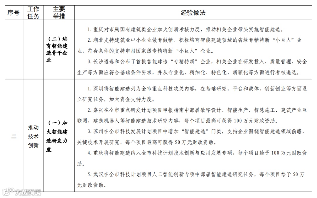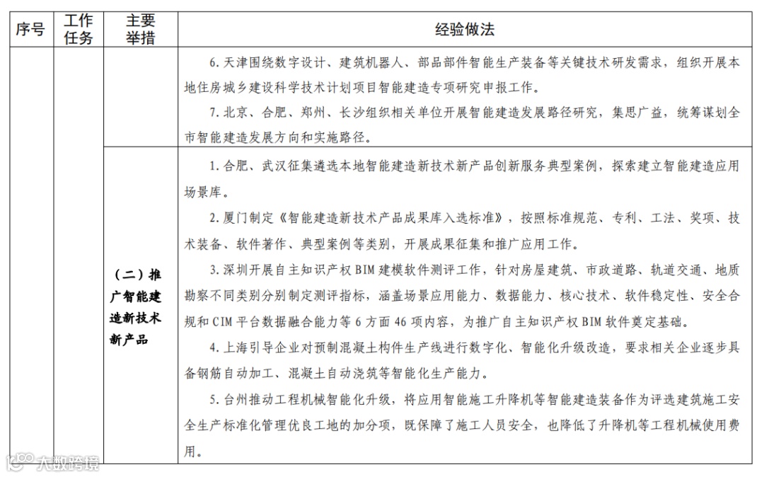 按照《住房和城乡建设部等部门关于推动智能建造与建筑工业化协同发展的指导意见》(建市〔2020〕60号)、《住房和城乡建设部关于公布智能建造试点城市的通知》(建市函〔2022〕82号)等文件要求,各地以试点示范为抓手,加快完善发展智能建造的政策体系、产业体系和技术路径,推动建筑业转型发展工作取得积极成效。现将有关经验做法印发给你们,请结合实际学习借鉴。