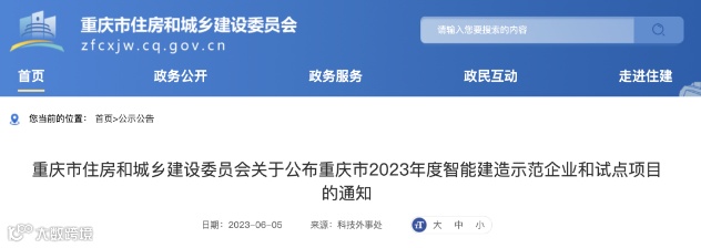 日前,重庆市住建委发布《关于公布重庆市2023年度智能建造示范企业和试点项目的通知》确定6家企业为重庆市2023年度智能建造示范企业,17个项目为重庆市2023年度智能建造试点项目。