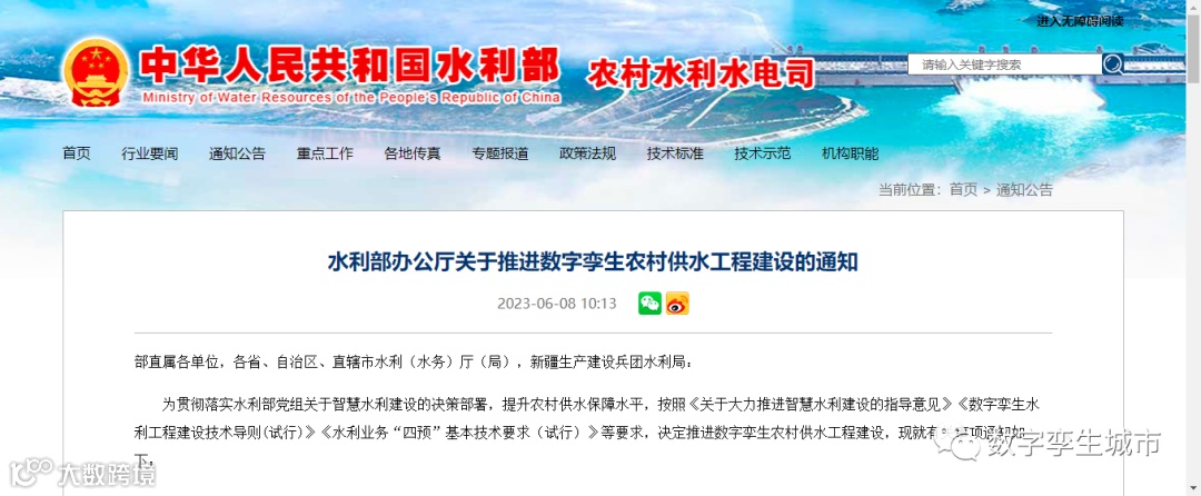 据水利部消息,水利部印发关于推进数字孪生农村供水工程建设的通知,目标用3年左右时间,新建或改造提升一批数字孪生农村供水工程,完善技术标准体系,建成可以共建共享的数据底板和数字孪生平台,迭代提升信息化基础设施,提高关键业务智能化和多级协同应用,增强数据共享和网络安全防护能力,提升农村供水工程效益和服务保障水平,为新阶段农村供水高质量发展提供数字赋能和支撑。