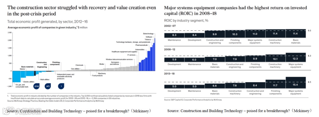 国际上建筑行业占整个世界经济比例较高,但劳动生产率较低,低于制造业和GDP的增幅,利润率低于3%。