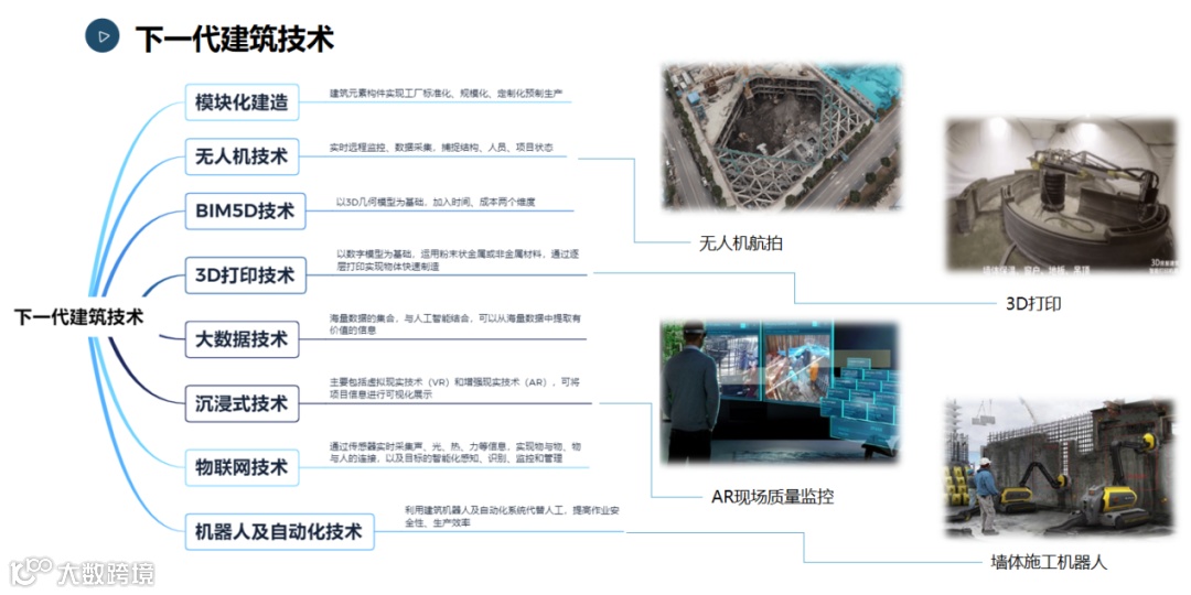 五大关键技术领域:建筑产业互联网平台及服务、BIM+数字一体化设计、建造机器人及智能装备、部品部件智能生产线和BIM/AI+智慧工地。