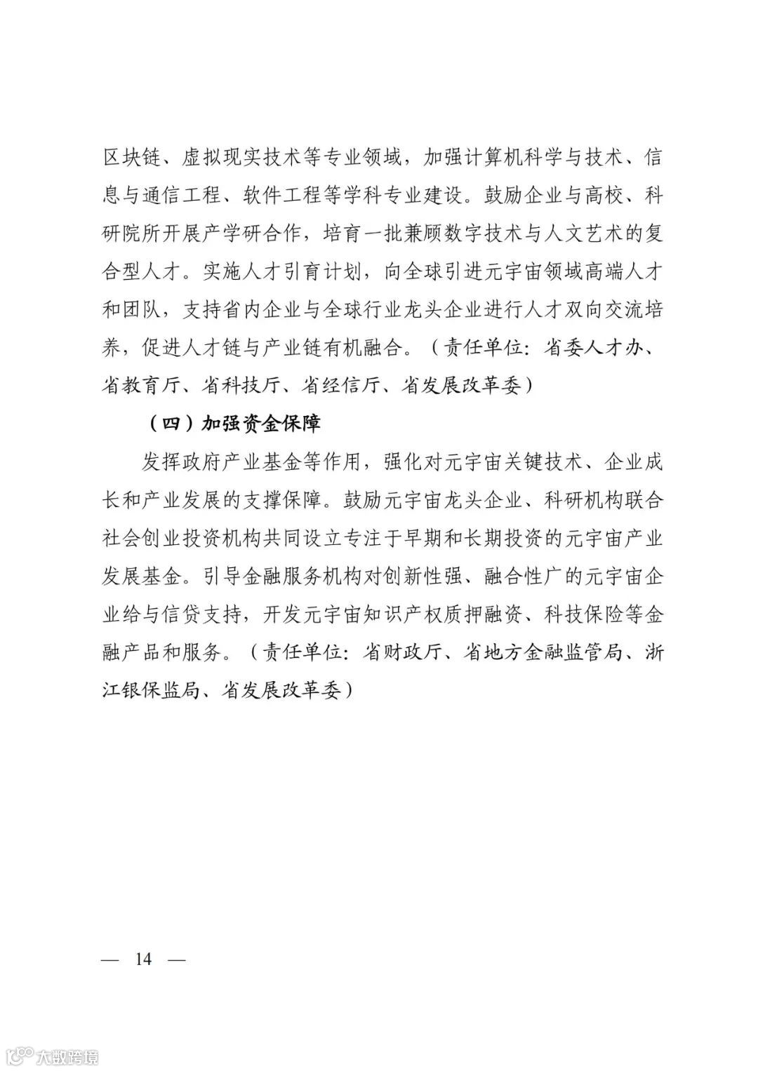 省级相关部门共同组建元宇宙工作小组,建立统筹协调、协同联动机制,整合创新企业、行业专家、智库单位等力量召开联席会议,加强行动计划的组织落实、跟踪评估、督促指导,探索多种发展模式和路径。依托科研院校、龙头企业、产业联盟等力量组建元宇宙专家库,为产业发展提供智力支撑。(责任单位:省发展改革委、省委宣传部、省委网信办、省经信厅、省科技厅、省商务厅、省市场监管局、省文化和旅游厅、省教育厅、省财政厅、省广电局)