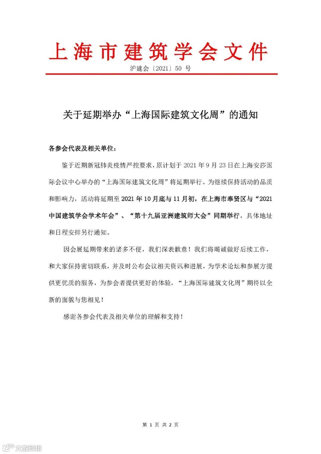 鉴于近期新冠肺炎疫情严控要求,原计划于2021年9月23日在上海安莎国际会议中心举办的“上海国际建筑文化周”将延期举行。为继续保持活动的品质和影响力,活动将延期至2021年10月底与11月初,在上海市奉贤区与“2021中国建筑学会学术年会”、“第十九届亚洲建筑师大会”同期举行,具体地址和日程安排另行通知。