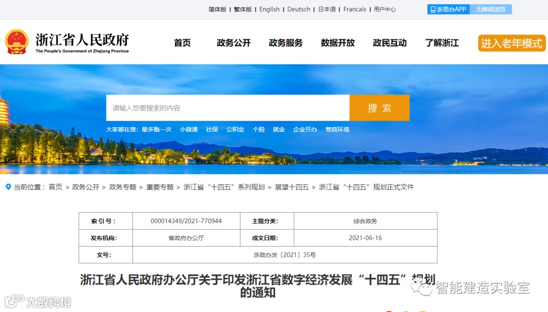 浙江省人民政府办公厅发布《浙江省数字经济发展“十四五”规划》