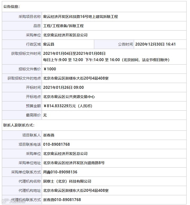 公告名称:密云经济开发区科技路16号地上建筑拆除工程公开招标公告