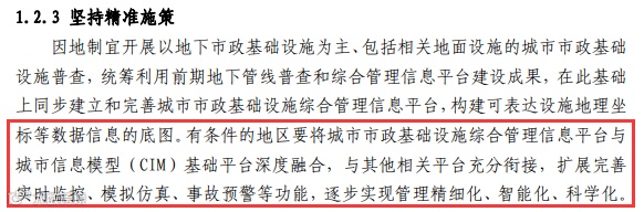 • 因地制宜开展以地下市政基础设施为主、包括相关地面设施的城市市政基础设施普查,统筹利用前期地下管线普查和综合管理信息平台建设成果,在此基础上同步建立和完善城市市政基础设施综合管理信息平台,构建可表达设施地理坐标等数据信息的底图。有条件的地区要将城市市政基础设施综合管理信息平台与城市信息模型(CIM)基础平台深度融合,与其他相关平台充分衔接,扩展完善实时监控、模拟仿真、事故预警等功能,逐步实现管理精细化、智能化、科学化。