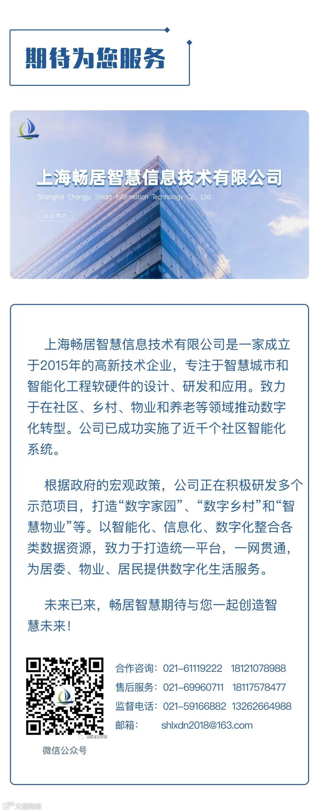 上海畅居智慧官方公众账号,主要分享企业实时信息,科技研发产品介绍,智慧安防、智慧物业真实案例分享,带你领略高速发展的智慧信息时代!